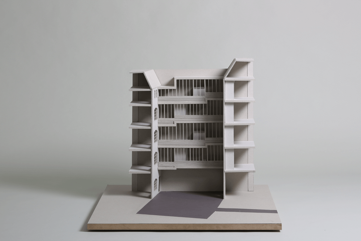 An Stelle eines Hinterhofes ist die Projektierung eines Neubaus vorgesehen, der den Raum mit einem Gebäudevolumen adäquat ausfüllt. Da der Hof einerseits klein dimensioniert andererseits wichtiger Außen- bereich (Lichtquelle) und Verteiler (Verkehrsfläche) für den Bestand ist, ist eine Auseinandersetzung mit der Erschließung, dem Raumprogramm, der Lichtführung sowie der Fassadengestaltung unabdingbar. Die unausgebauten Hinterhöfe verstehen wir für unsere Aufgabe als Potenziale für prototypische Wohn- strukturen, aber auch als Schnittstellen diverser Funktionen und Nutzer. Dem Wohnen werden daher als plus die Zusatzfunktion Arbeiten zu einem Wohnen+ hinzugefügt. Ausgangspunkt für den Entwurf ist der Umgang mit der vorhandenen Bausubstanz, die wir als „Gesprächspartner“ wahrnehmen. Die Identität der Hinterhöfe ist durch die bestehenden Strukturen, die Fassaden und Gebäudefluchten bestimmt. Dies schließt jedoch für den Neubau „Erfindungen“ nicht aus, die neue Bedürfnisse abdecken, neue Bezüge und Akzente setzen, allenfalls bereits im Straßenraum auf den Innenhof aufmerksam machen.