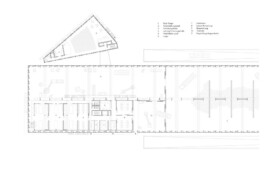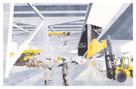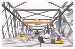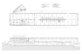 Recyclingprodukte direkt nach der Aufbereitung in das offene Depot auf der anderen Seite oder das wettergeschützte Depot im oberen Geschoss des Riegels, welches ebenfalls durch zwei Große Rampen erschlossen werden kann und gleichzeitig, wie ein wertvoller ‚Schatz‘ über dem Hafengelände schwebt. Von der Beusselstraße aus kann man unter dem Riegel auf das Hafengelände hindurchschauen, da dieser 12m über dem Hafenkanten Nieveau “schwebt”. Die Depotflächen und die komplette Materialaufbereitung sind ihrer Länge nach für vorbeilaufende Passanten einsehbar, wie eine Schaubühne.